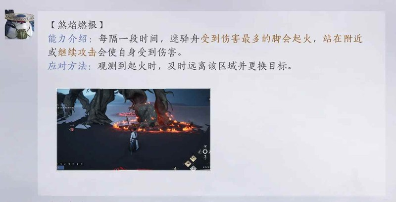 迷驿舟1-1/1-3:煞焰燃根,分别对应自身不吃到该技能伤害和全队最多吃到两次伤害。