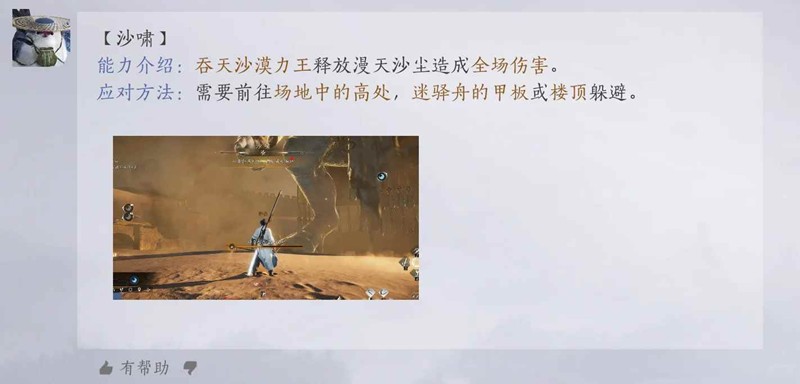 迷驿舟2-3:沙啸,全队不吃伤害,需要上楼顶或者船甲板,阁楼二楼也会吃到,一定要在楼顶,反应时间不长,需要提前准备好直接大轻功上楼。