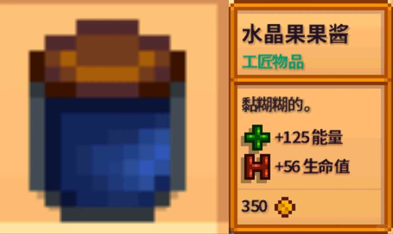①水晶果:能量值+125;生命值+56;价格+350。(铱300金225银187普150酒450干230),建议酿酒。
