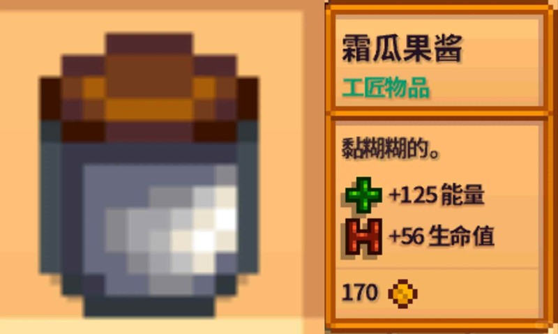 ②霜瓜:能量值+125;生命值+56;价格+170。(金90银75普60酒180干95),腌制酿酒均可。