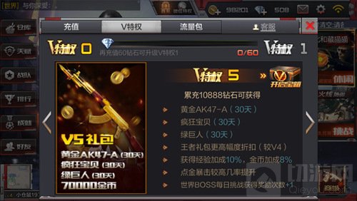 特权福利:黄金AK47-A(30天),疯狂宝贝(30天),绿巨人(30天),7W金,王者礼包一定幅度折扣(较V4),经验加成10%,金币加成8%,点金暴击几率较高提升,世界BOSS每日挑战获得奖励次数+1