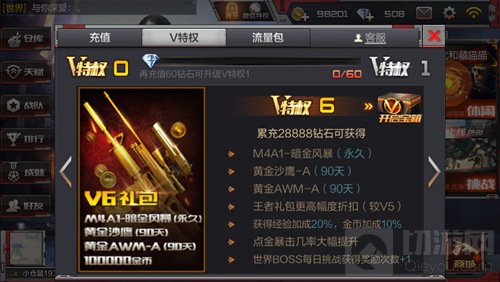 特权福利:M4A1-暗金风暴(永久),黄金沙鹰-A(90天),黄金AWM-A(90天),10W金,王者礼包一定幅度折扣(较V5),经验加成20%,金币加成10%,点金暴击几率大量提升,世界BOSS每日挑战获得奖励次数+1