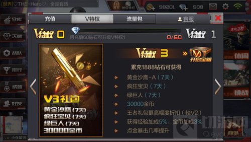 特权福利:黄金沙鹰-A3天,复活币3个,2W金,获得经验加成3%,王者礼包一定幅度折扣(较V1),金币加成2%,点金暴击几率小幅提升