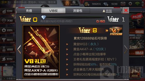 特权福利:黄金MG3(永久),黄金AK47-A(120天),点金小概率出现3倍爆率,王者礼包一定幅度折扣(较V7),获得经验加成50%,金币加成20%、点金暴击几率大幅提升,世界BOSS每日挑战获得奖励次数+1
