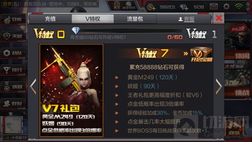 特权福利:黄金M249(120天),妖姬(90天),王者礼包一定幅度折扣(较V6),点金低概率出现3倍爆率,获得经验加成30%,金币加成15%,点金暴击几率大幅提升,世界BOSS每日挑战获得奖励次数+1