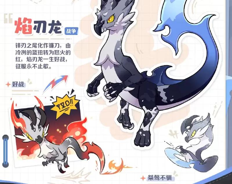 焰刃龙最具辨识度的特征之一便是其锋刃之尾,这一部位可在战斗中发生形态变化,由原本的蓝色转化为红色,并化作镰刀形态进行攻击。这种视觉上的转变不仅增强了技能释放时的打击感,也暗示了角色在战斗中进入更高阶的战斗状态。颜色由蓝转红的过程象征着能量的激发与战意的攀升,配合流畅的动作设计,使得每一次攻击都充满力量感与节奏感,进一步强化了其作为战斗狂人的形象。