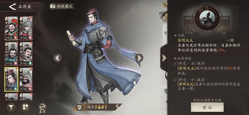 李典的核心技能“深明大义”触发频率极高,几乎每回合都能生效。基础效果为当李典与友军相邻时,双方获得12%减伤。该技能在五阶升迁后还会额外提供8%的伤害加成,到了十阶更可将相邻影响范围扩展至周围一圈单位。实战中通常将李典部署在曹操与张辽之间,使两名主力武将同时享受减伤收益。这种持续性的防御加持在持久战中表现尤为突出,其战略价值甚至超过部分治疗型武将。