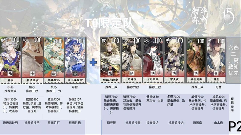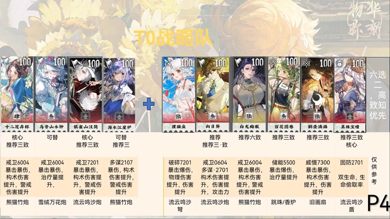 主流玩法,控制输出一体,操作简单,海水江崖炉有的时候需要放到其他队伍,所以白龙鸟音等都可以,建议带一名远击对策远程,百花可以提高队伍伤害,铜壶其实不如书记在队伍里面提升,真珠可以提高队伍生存,适配效果嘎嘎爽。