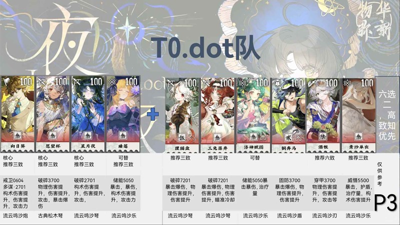 如果星月夜有三致知,可以单走。对群对单输出都比较高。奶妈生存位目前没有特别适配的之后可能会出一个针对性的奶/辅。
