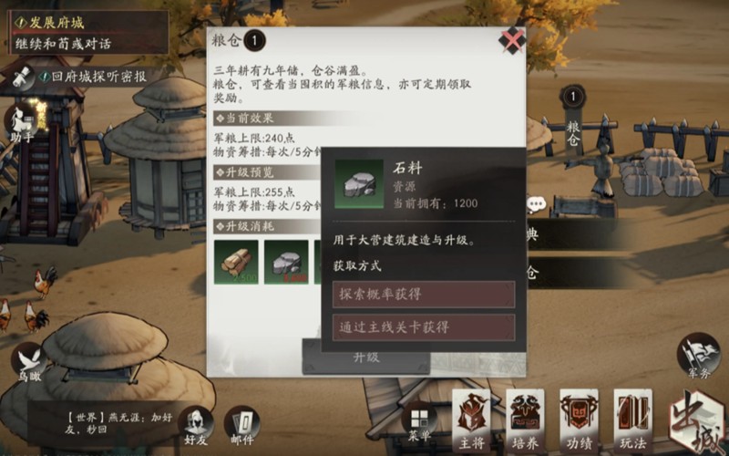 游戏内设有粮仓系统,军粮是武将行军作战的必要资源。玩家需要不断提升粮仓等级来增加粮食容量,这样不仅能提高体力上限,还能加快军粮的产出速度。升级粮仓所需的材料可以通过地图探索或完成特定关卡获得,建议玩家在三国望神州中多关注这方面的资源积累。