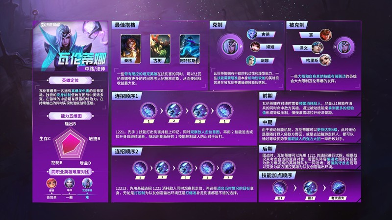 在游戏中,瓦伦蒂娜拥有不错的机动性和爆发能力,一些技能需要瞄准且本身机动性较差的英雄很容易被瓦伦蒂娜带领躲避技能后落败。然而,一些大招和自身其他技能有强联动的英雄会大大限制瓦伦蒂娜的发挥。