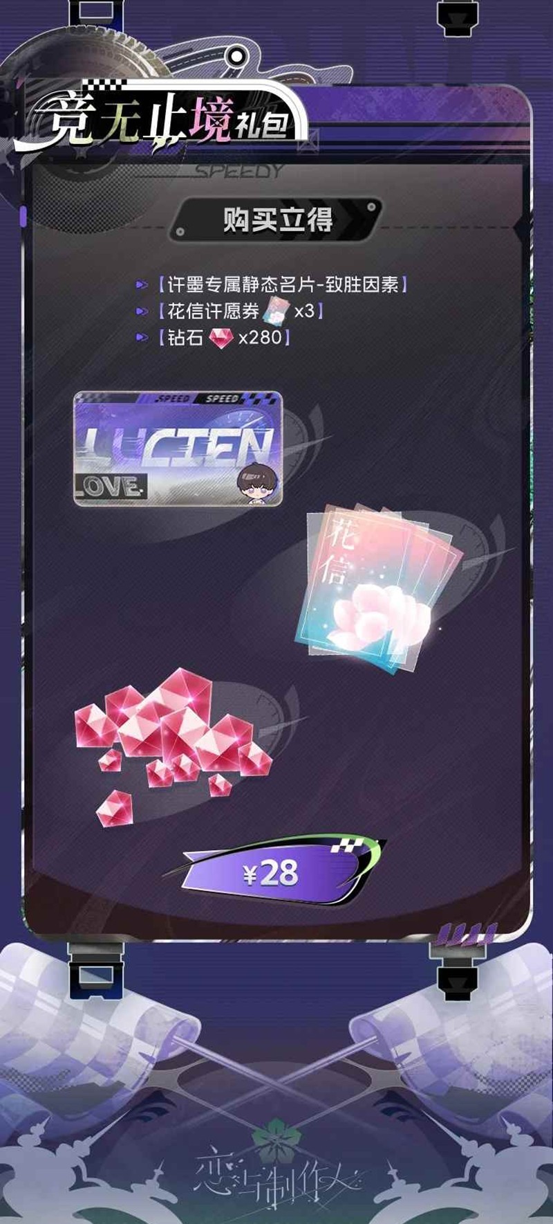 竞无止境礼包:购买立得【钻石*280、花信许愿券*3、许墨专属静态名片-致胜因素】,售价28元,活动期间限购1次。