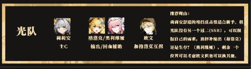 欧文作为SR级别的角色,虽在个体强度上不如SSR单位亮眼,但在辉烬光队中承担着重要的体系衔接作用。他能通过冲击技能进行范围输出,并在怒气充足时释放强力技能打出可观伤害。更重要的是,他与格洛克或奥利维娅之间的标签联动为队伍提供了稳定的属性加成。尽管后期可替换为其他具备连携能力的光属性角色,但在当前版本中,欧文仍是大多数玩家组建辉烬光队时的最优解之一。他的防御能力和抗压表现也为队伍提供了额外保障。