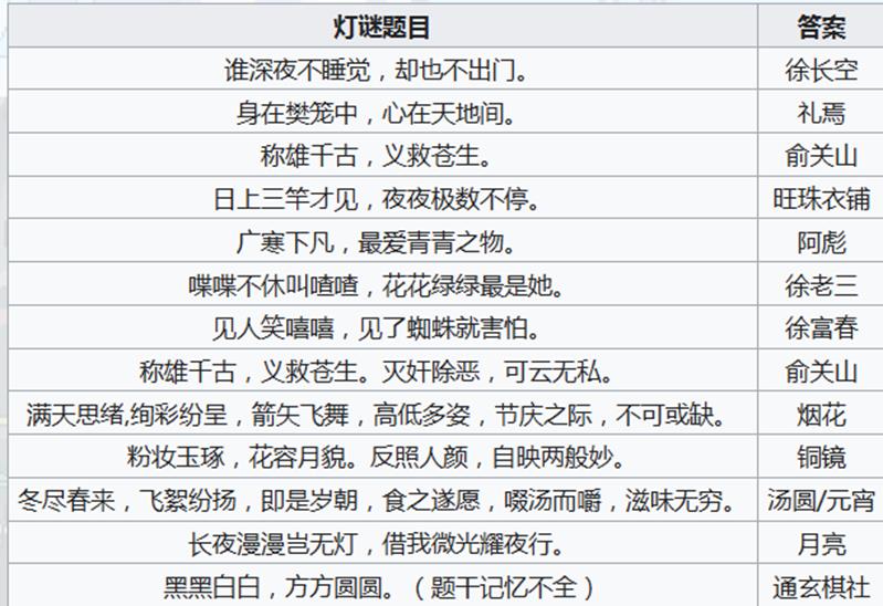 柴老夫人处的灯谜则偏向生活化与节庆元素,谜面更具诗意。如“满天思绪,炫彩纷呈”描述的是烟花,因其在夜空中绽放时绚丽多彩。“花容月貌,反照人眼”指向铜镜,取其映照面容之意。“冬尽春来,食之随愿”显然指的是元宵或汤圆,象征团圆与愿望达成。“长夜漫漫岂无灯”谜底为月亮,寓意其在黑夜中照亮大地。还有一道较难的谜题“黑黑白白,方方圆圆”,答案为通玄棋社,暗指围棋棋盘与棋子的形态特征。