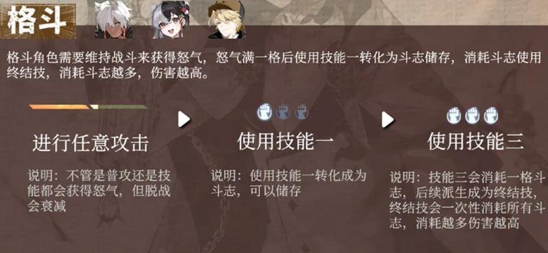 格斗型角色以怒气为驱动资源,通过普攻或技能积攒怒气值。当怒气满格后自动转化为斗志储存,用于释放终结技。消耗的斗志越多,终结技伤害越高。部分技能如技能三,在具备足够斗志的情况下可触发派生效果,并转变为终结技形态,一次性消耗全部斗志造成巨额伤害。需要注意的是,脱战状态下怒气会随时间衰减,因此保持持续输出是维持战斗力的关键,频繁使用技能有助于快速累积斗志。