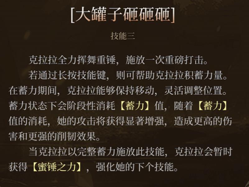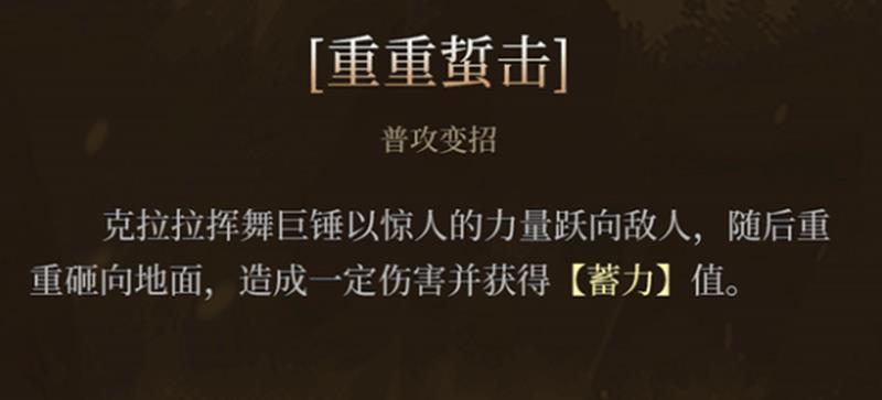 在拥有秘锤之力后,克拉拉的技能将被强化为重重蛰击。该技能会让她挥舞巨锤快速接近目标,并以强力砸地造成范围伤害。除了可观的输出外,重重蛰击还能为克拉拉补充额外蓄力值,进一步加快能量循环。这一技能兼具位移与伤害,在面对单体高威胁目标时尤为实用,是衔接连招的重要节点。