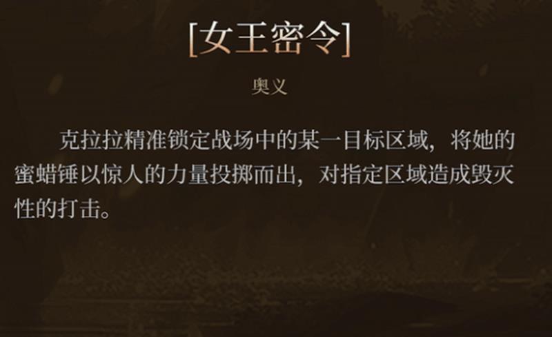 克拉拉的终极技能女王命令是一项远程范围打击技。她将锁定战场指定区域,投掷蜜蜡锤造成大范围爆炸伤害。该技能适合在敌人聚集时使用,尤其在配合技能二的位移压制后接续释放,可打出成吨的群体伤害。当克拉拉拥有充足蓄力值时,技能派生与状态联动将进一步提升爆发上限,使其在团战中发挥关键作用。