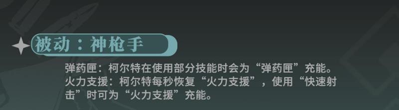 柯尔特的被动技能名为神枪手,与弹药匣和火力支援系统紧密相关。每当柯尔特释放技能时,都会为弹药匣充能,而火力支援则会随时间自动恢复。当火力支援值达到一定水平后,可触发被动效果,提升整体输出效率。此外,在使用快速射击时,还能额外为火力支援充能,形成良性循环。这一机制使得柯尔特在长时间战斗中具备较强的续航能力,只要操作得当,就能维持稳定的火力压制。
