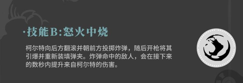 二技能怒火中烧具有一定的位移和控场能力。释放时柯尔特会向后翻滚,同时向前投掷一枚炸弹。这枚炸弹不会立即爆炸,而是需要玩家手动开枪引爆。成功命中敌人后,不仅能造成范围伤害,还能为柯尔特补充部分弹匣容量,并在后续一段时间内提升其造成的伤害。这一技能适合作为起手技,用于拉开距离的同时建立输出优势,也为后续技能衔接提供了良好基础。