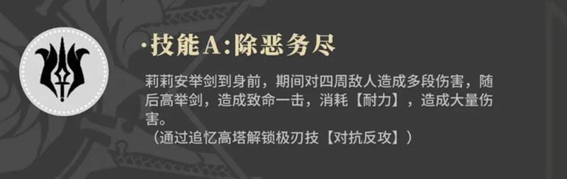 莉莉安的一技能名为除恶务尽,释放时她将剑前指,对周围敌人造成多段伤害,并在最后阶段触发一次高额的致命输出。该技能具有一定的范围判定,适合清理靠近身边的多个目标。不过由于其为近战性质,有效范围受限,需贴近敌人才能最大化覆盖。致命输出部分消耗耐力较多,伤害随耐力投入提升而增加,该技能需通过追忆高塔系统解锁,属于中后期逐步成型的能力。