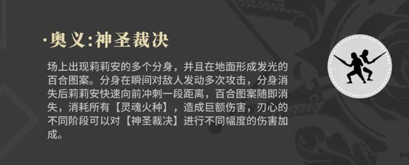莉莉安的大招召唤多个分身参与战斗,分身会在地面留下百合花形状的光痕,并对范围内敌人发动高频攻击。在技能持续时间内,分身不会轻易消失,保障了长时间的输出覆盖。技能结束时,莉莉安将向前冲刺一段距离,脱离当前战区,同时清除地面残留图案。冲刺动作可用于调整站位或躲避后续技能,增强了战场机动性。此外,大招期间积累的灵魂火种可转化为额外爆发伤害,进一步提升终结阶段的输出峰值。