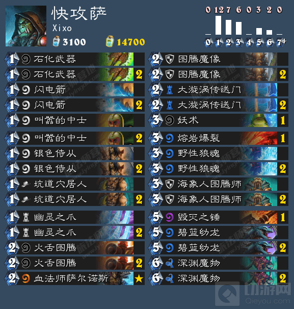 Xixo在一套带了血法师萨尔诺斯和碧蓝幼龙的快攻萨卡组中添加了新卡幽灵之爪。这张新卡也能配合萨满的空气之怒图腾。
