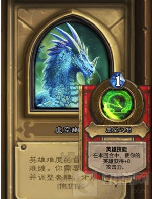 第 二个BOSS是虚空幽龙,英雄技能普通难度为2费英雄本回合获得3攻,英雄为1费本回合获得8攻,值得注意的是这个技能是自动使用的,对BOSS的费用规 划是有影响的。地图机制比较有意思,场上有红蓝两个传送门,红色光线触及的角色获得风怒,蓝色光线触及的角色每次只会受到一点伤害,一开始两条光线都是 buff给BOSS的,而我们需要做的就是用随从来挡住光线,避免给BOSSbuff,同时可以保护随从、增加输出。