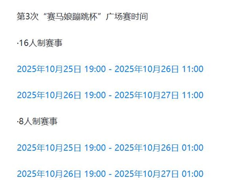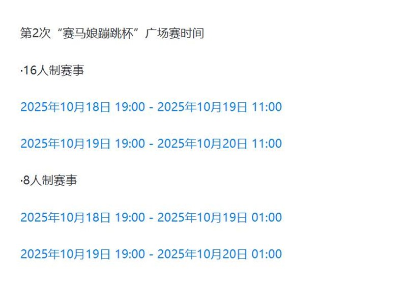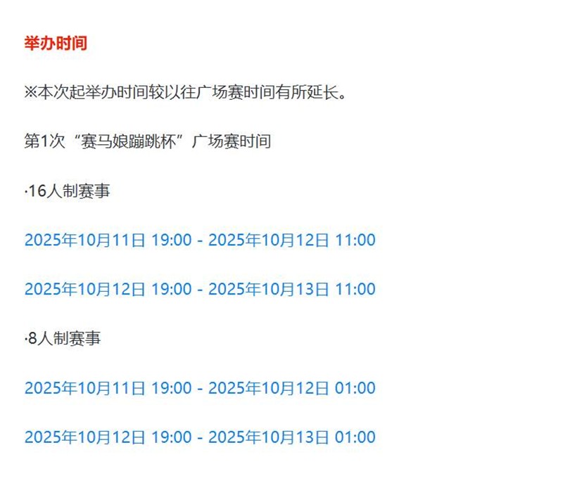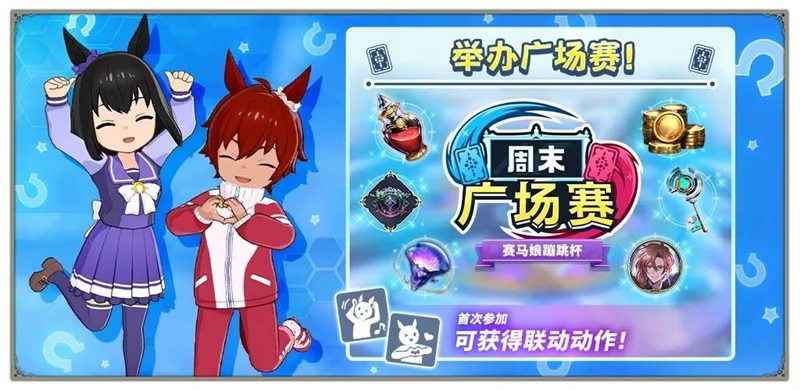 赛马娘迷你联动举办期间中,将举办广场赛“赛马娘蹦跳杯”!作为“赛马娘蹦跳杯”的参加奖励,可获得2种“赛马娘蹦跳传说”联动动作。广场赛将同时以8人制和16人制形式举办。