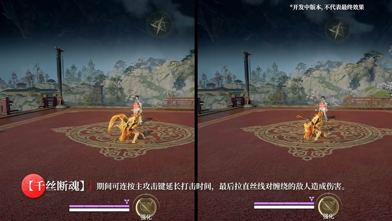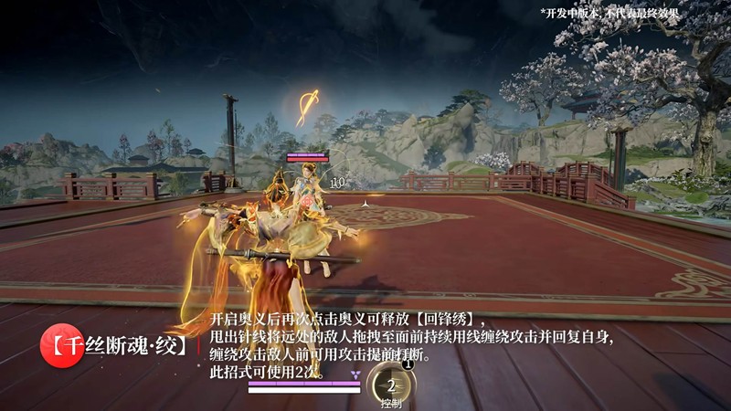 另一个技能“无影针·刺”是一个强力的控制技能,发动后,南宫锦会发射金针,命中敌人后可将其束缚在空中,使其无法进行任何操作。南宫锦的大招“织天”释放后,她会进入“织天”状态,通过一次跳跃在脚下生成丝线,在此状态下,她可以在丝线上自由行动,并且所有技能都会得到强化。