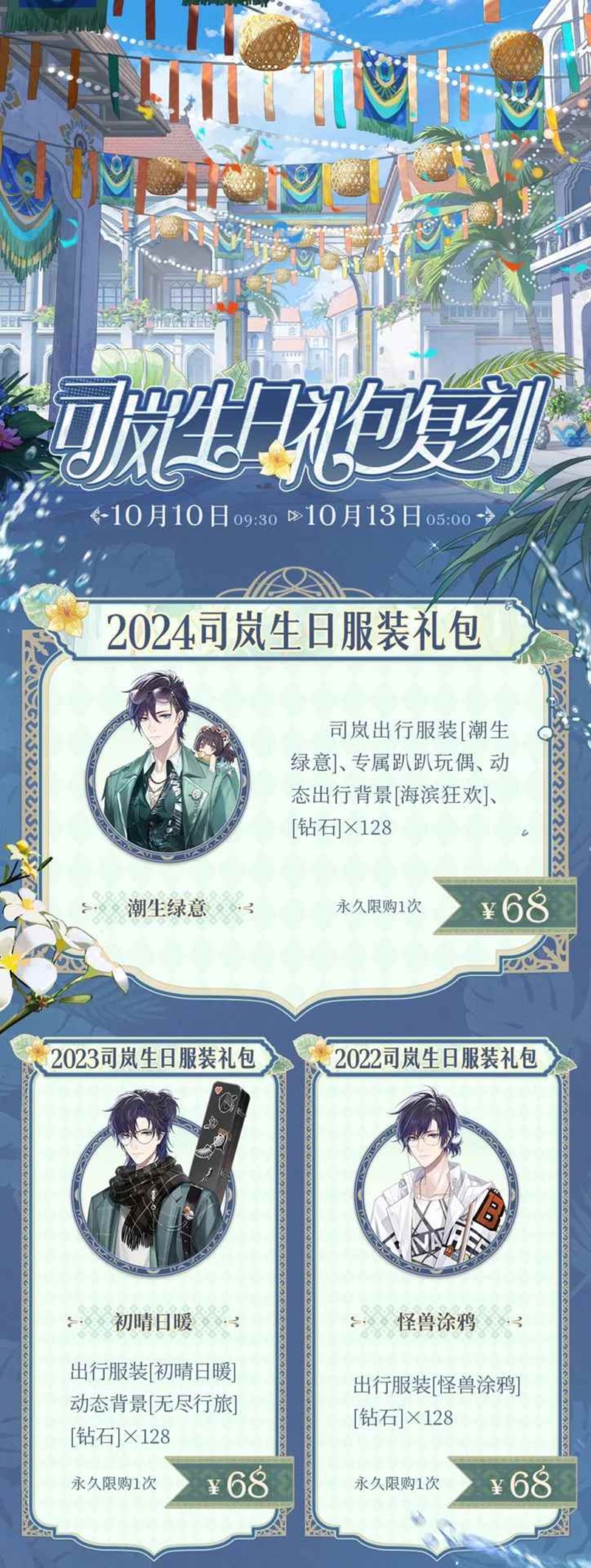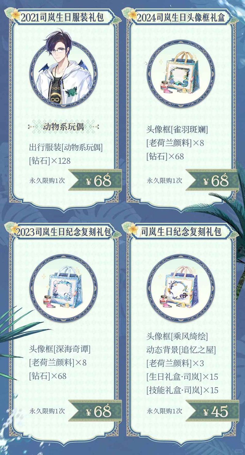 10月10日09:30 - 10月13日05:00,司岚往期生日服装礼包、[司岚生日纪念复刻礼包]、[2023司岚生日纪念复刻礼包]、[2024司岚生日头像框礼盒]限时返场,欢迎前往[采购]-[生日复刻]选购。