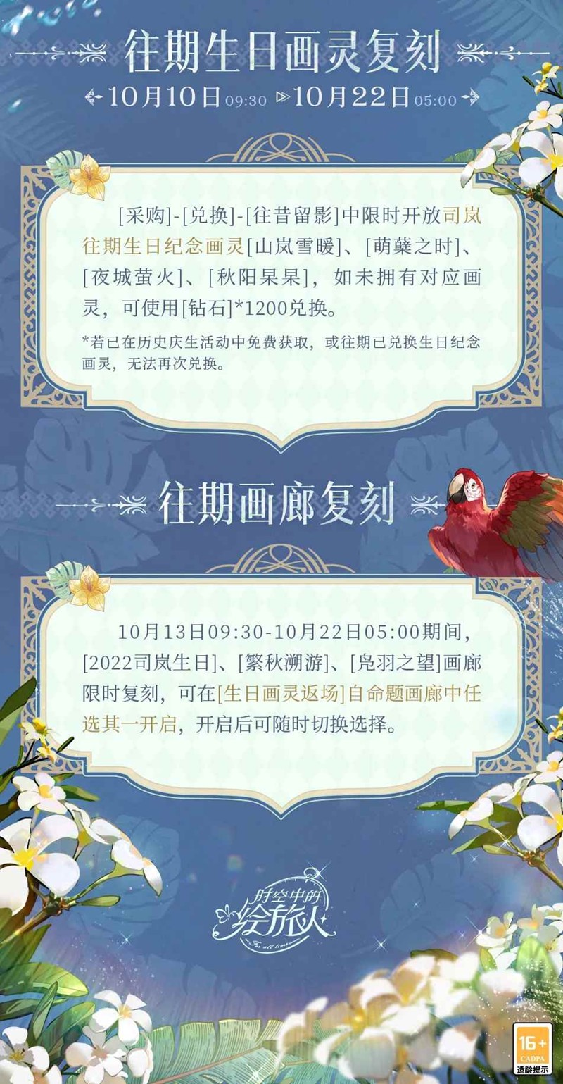 10月13日09:30 - 10月22日05:00,「2022司岚生日」「繁秋溯游」「凫羽之望」画廊限时复刻,可在[生日画灵返场]自命题画廊中任选其一开启,开启后可随时切换选择。