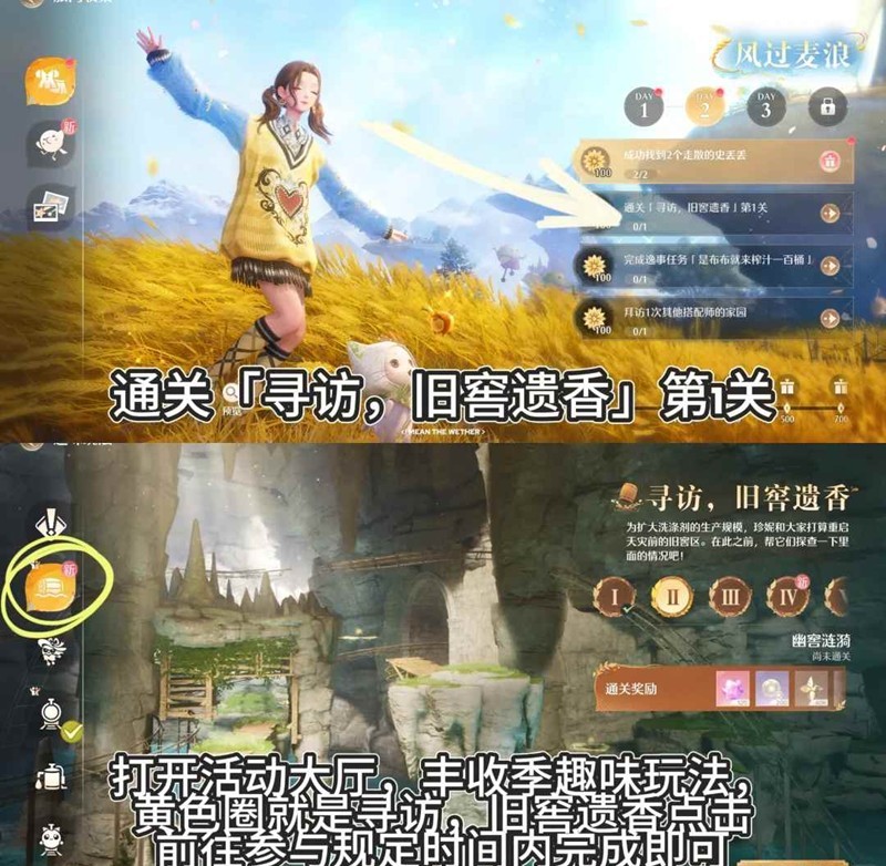 打开活动大厅,丰收季趣味玩法,黄色圈圈就是寻访,旧窖遗香点击前往参与规定时间内完成即可