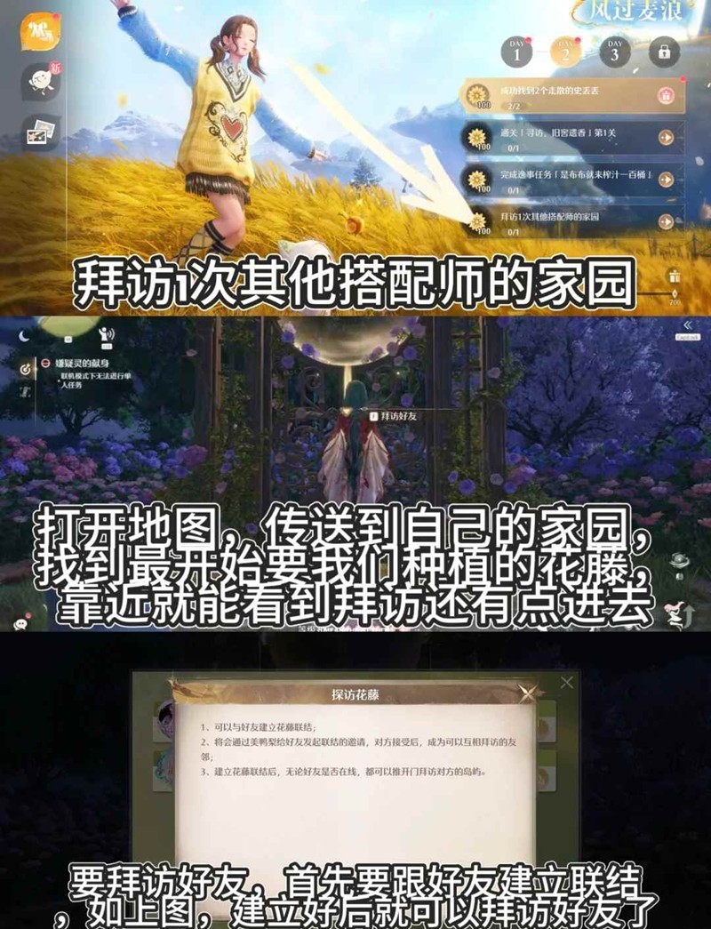 打开地图,传送到自己的家园,找到最开始要我们种植的花藤,靠近就能看到拜访好友点进去,要拜访好友,首先要跟好友建立联结,如上图,建立好后就可以拜访好友了