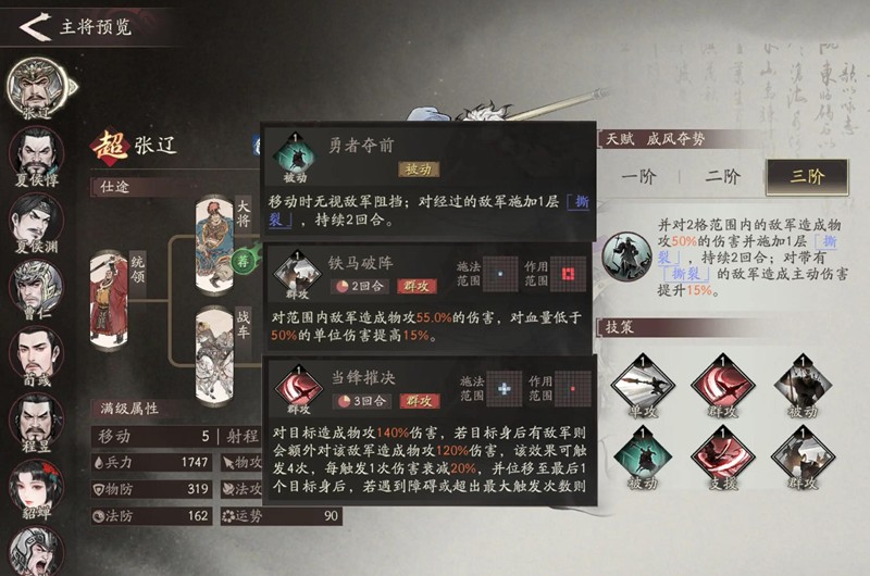 前期升阶最重要的是要有取舍,不要将资源浪费在过渡武将身上。在这里小编建议第一梯队必须优先保证郭嘉和张辽升到2阶,郭嘉2阶后普攻与战法射程增加1格,远程压制优势明显,三阶延长控制时间的收益相对有限。