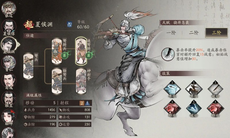 主力输出武将达到20级就可以开始升阶,曹仁和荀彧这类辅助武将的升阶优先级要往后排,完全可以等到30级再考虑。第二梯队武将可以缓一缓再升,夏侯渊2阶暴击率提升15%,是弓兵爆发核心,但三阶暴击回战意的实用性较低。夏侯惇2阶残血时能回复32%兵力,在没有奶妈的情况下是刚需,三阶的提升没必要急着解锁。张郃需要憋到3阶才发力,全武将克制增伤15%,搭配副将藏霸能叠加到20%,这个组合在后期打困难图时特别实用。