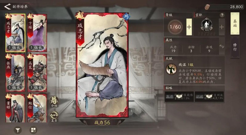 戏志才在兵力低于90%时能获得9%法攻加成,行动结束后若兵力仍低于50%还能恢复4%血量。这种动态平衡能力让他在郭嘉、许褚队伍中能发挥关键作用。想要最大化戏志才的输出增益,需要将兵力精准控制在50%-90%之间,这是发挥他能力的关键所在。