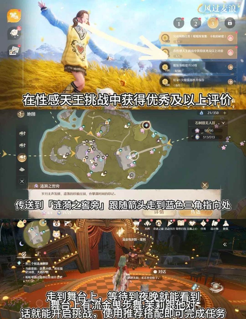 传送到「涟漪之窖旁」跟随箭头走到蓝色三角指向处,走到舞台上,等待夜晚就能看到舞台上的流金曵步舞·茉莉跟他对话就能开启挑战,使用推荐搭配即可完成任务