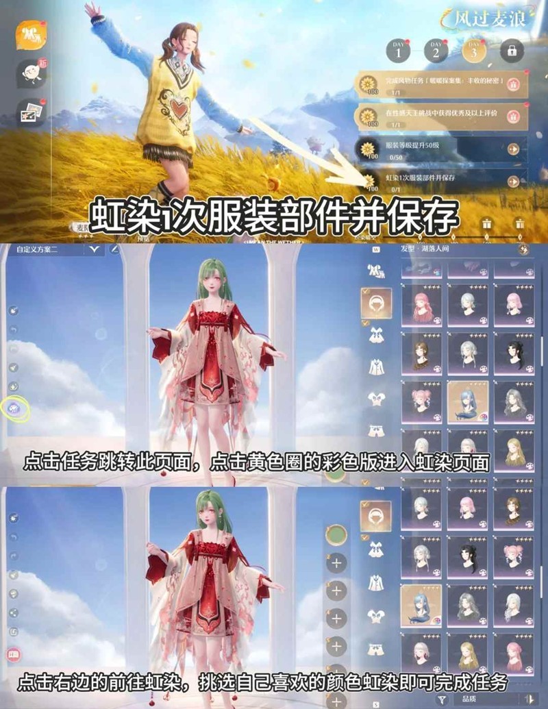 点击任务前往此页面,点击黄色圈的彩色板进入虹染页面,点击右边的前往虹染,挑选自己喜欢的颜色虹染即可完成任务