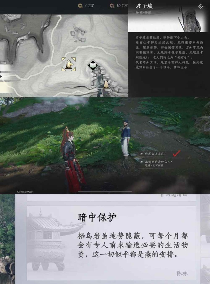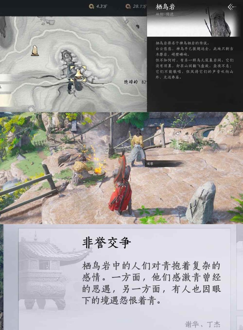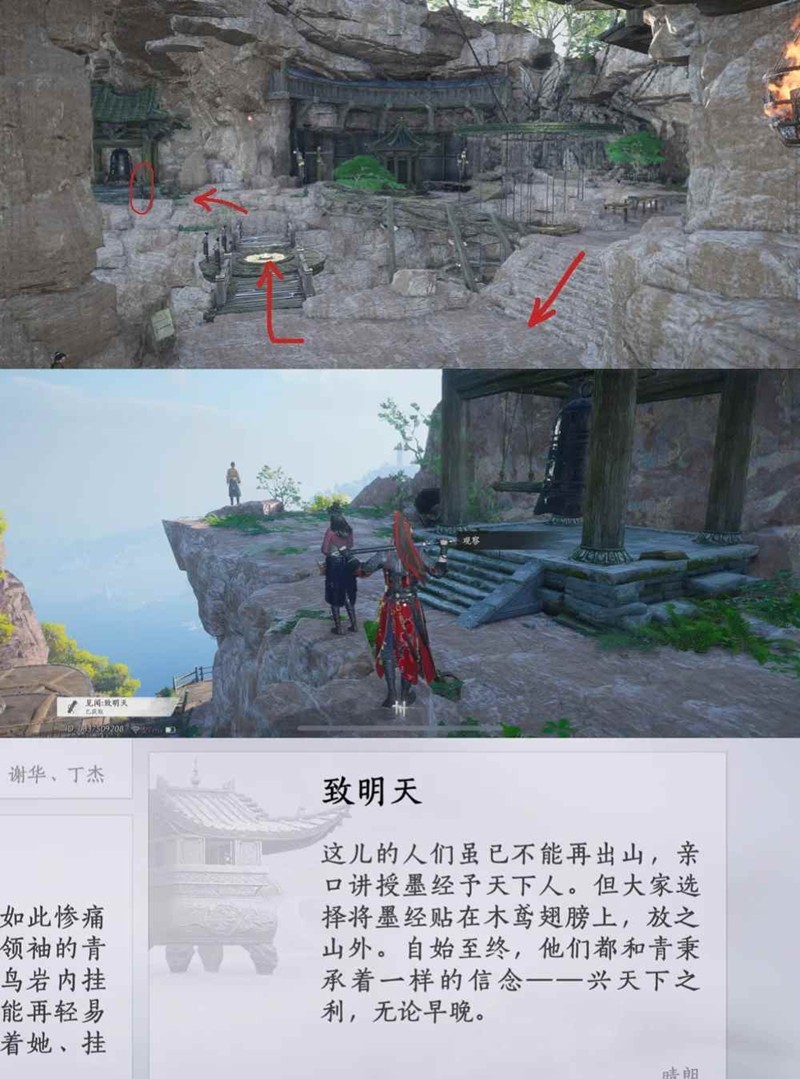 观察结束,原地大轻功飞上山顶(先大轻功一段到图中书阁位置,再大轻功一段上山顶),偷听NPC白云黑岩的对话