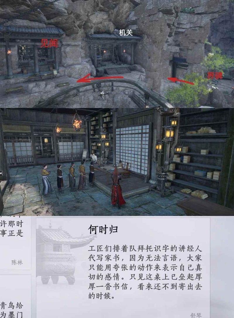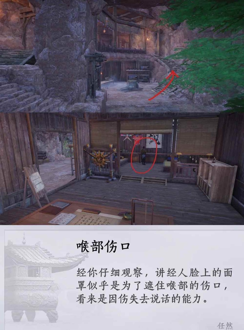 栖鸟岩界碑,转至身后石梯,上坡直走(经过机关悬撞)到木屋前,与屋内NPC舒琴对话