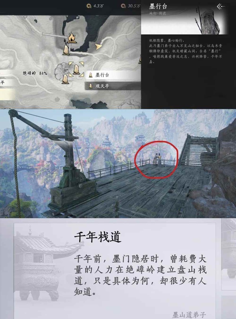 传送墨行台界碑,顺着右边的上山小路一直走,过破破烂烂的栈桥(有一个墨山道弟子在修路),上悬撞,落地后能看到两个窃窃私语的墨山道弟子,过去对话即可