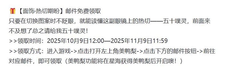 进入游戏->点击打开左上角美鸭梨->点击下方的邮件按钮->前往对应邮件,即可领取(美鸭梨功能将在星海获得美鸭梨后开启噢!)