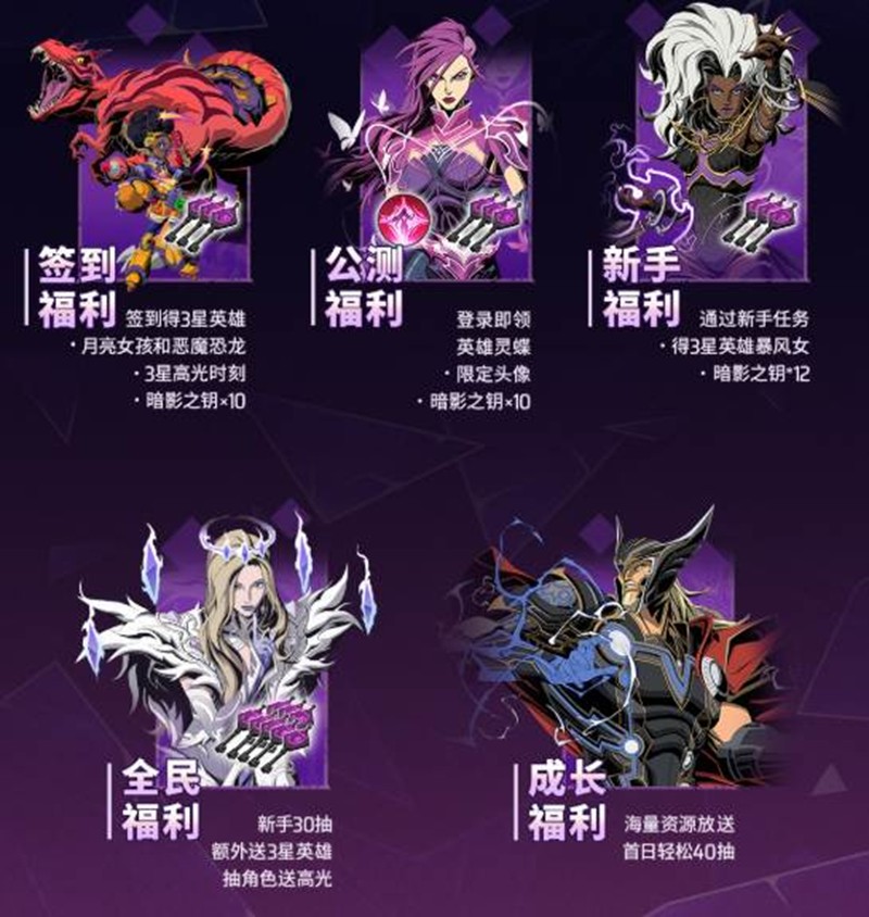 公测福利:所有玩家在公测期间登录游戏,即可领取英雄灵魂和限定头像,更有暗影之钥*10等丰厚奖励,让玩家快速积累资源,享受游戏乐趣。