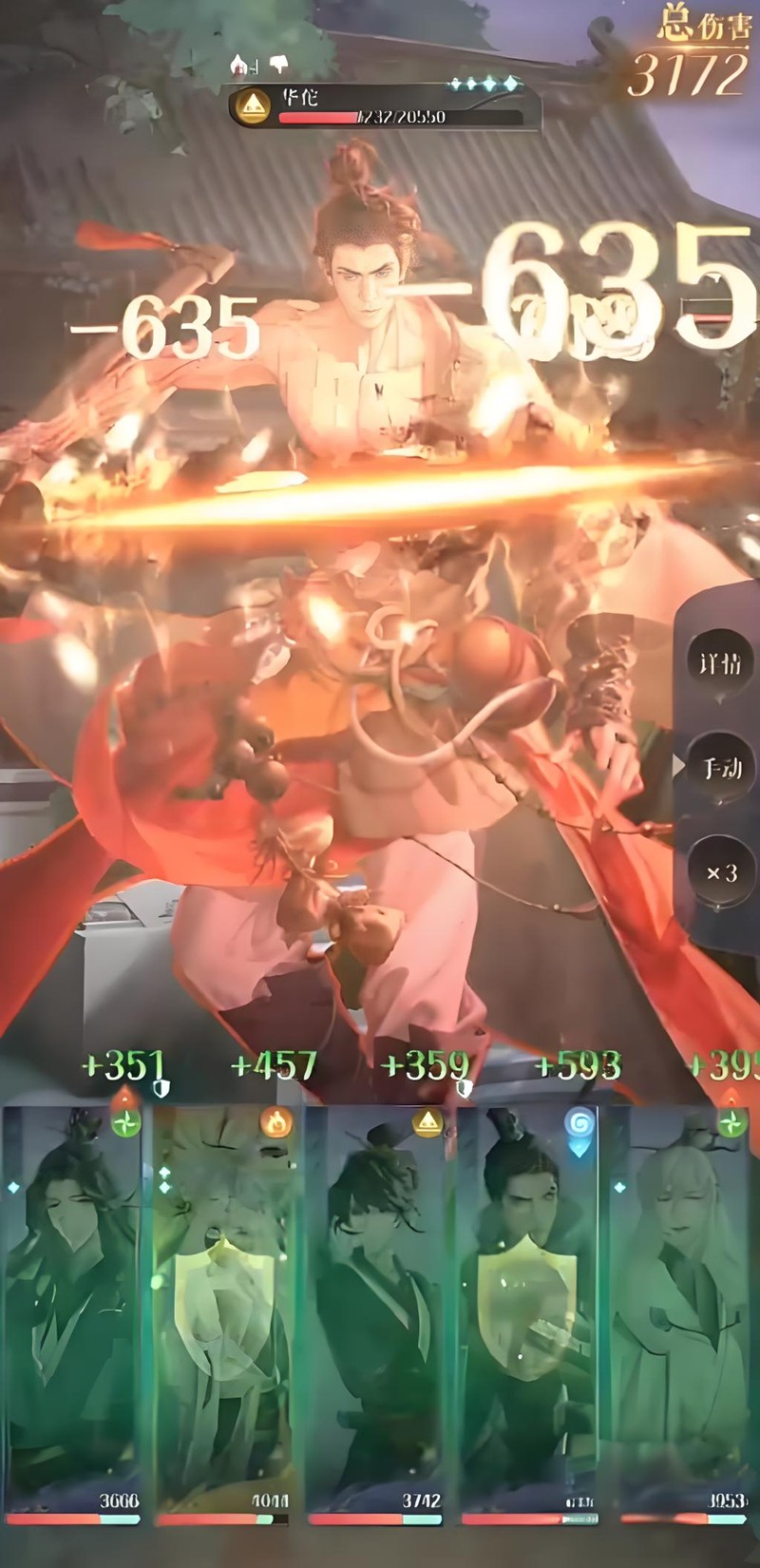 第四回合颜良发动攻击时可能会承受杨修的单体大招,导致血量大幅下降。这时史子眇需要及时释放大招为颜良回复生命值。郭解同时开大提供护盾,陈登则配合为队友回复能量。第五到六回合继续锁定华佗进行普通攻击。