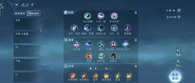 内功:必带破霄|昆吾|汲川|熔甲,优先保证3金3火1木前提下,破戟|灼锋|逢虚|锐锋根据入战收益4选2