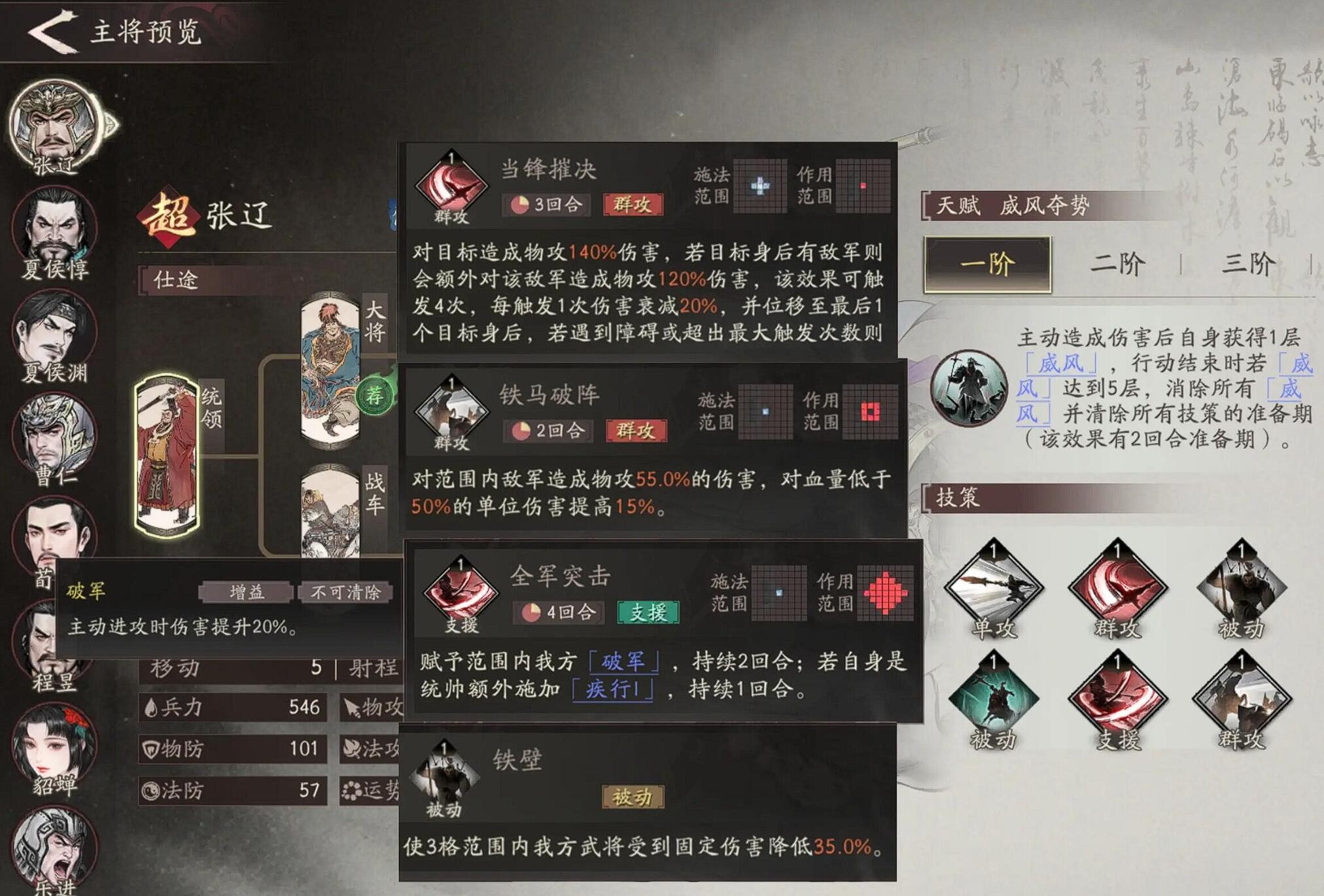 张辽的被动技能在攻击前会计算移动距离,每移动1格增加3%伤害,因此开战前需要调整站位。配合突袭自带的15%加成,实际能打出30%的额外伤害,足以秒杀同等级的荀彧。这个移动增伤机制虽然不会显示在技能描述中,但在训练场木桩测试中是有效果的。