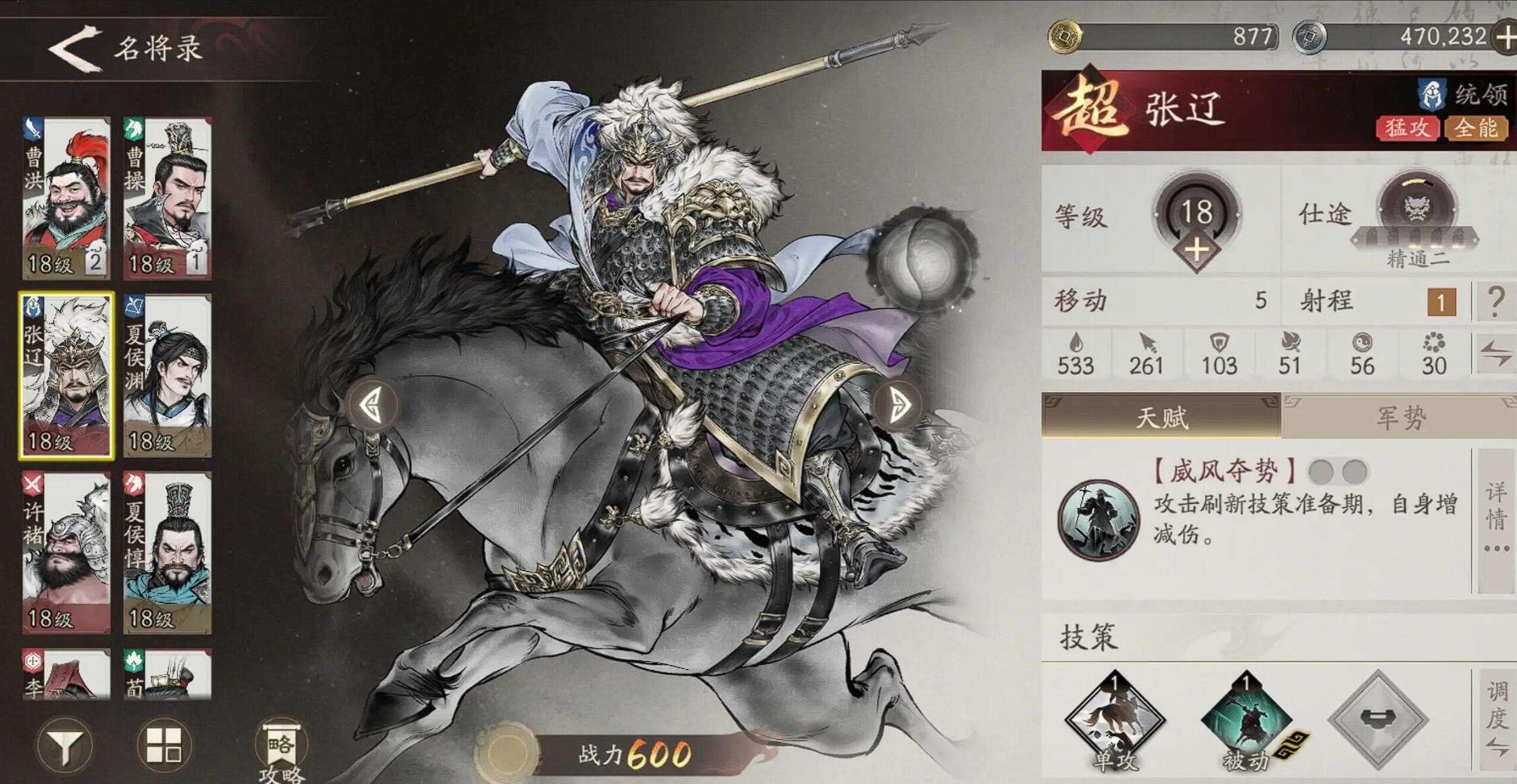 勇者夺前这个技能比较特殊,它允许张辽移动时无视地形阻挡,攻击附带撕裂效果,配合天赋可以触发15%增伤。在PVE清场时效果很好,PVP中也能限制对手走位,但由于升级带来的提升不大,所以排在加点顺序的最后。这并非因为技能强度问题,而是性价比考量。