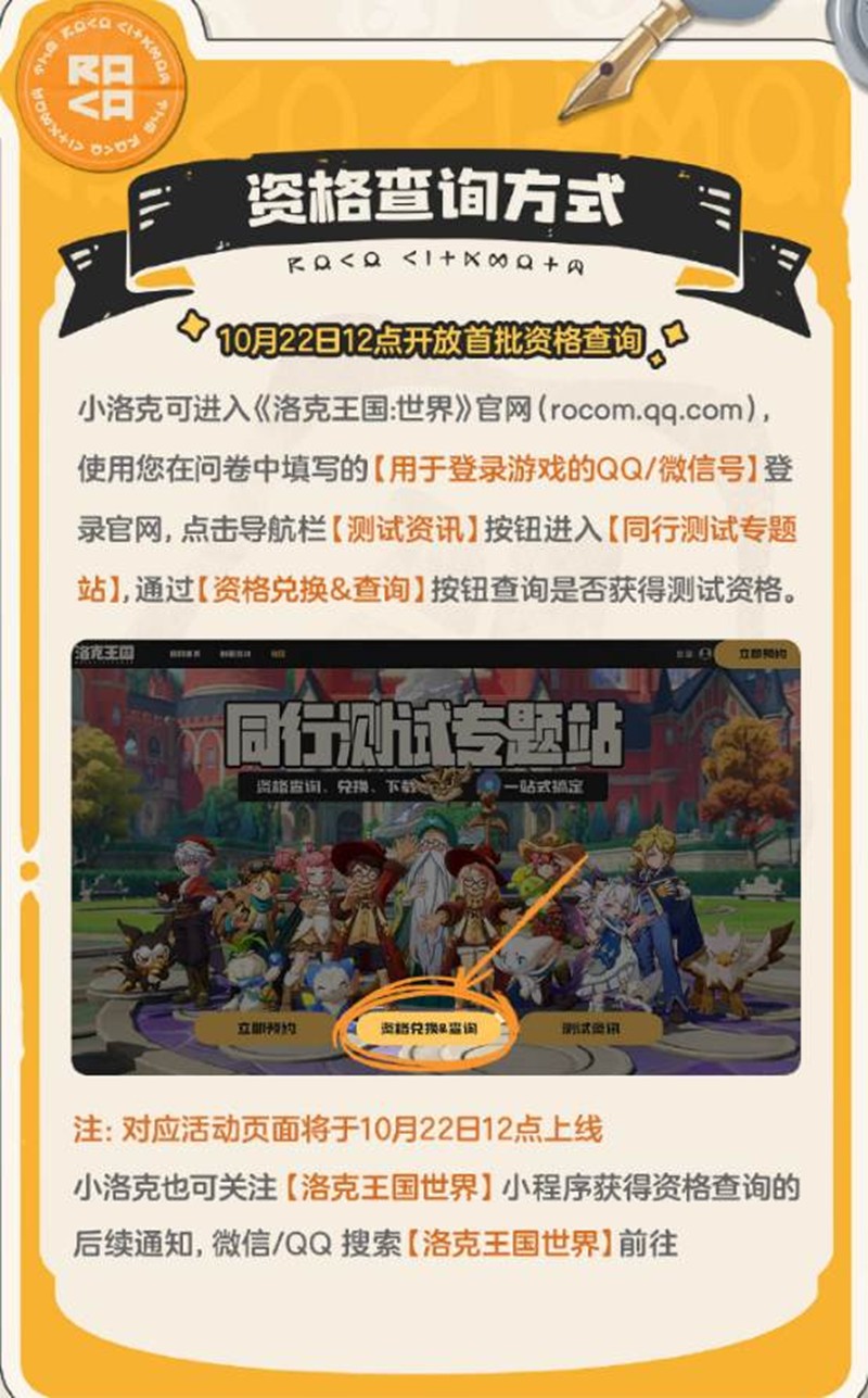 10月22日12点,官方将开放首批资格查询。玩家可以进入《洛克王国:世界》官网,使用在问卷中填写的QQ/微信号登录,点击导航栏的“测试资讯”按钮进入“同行测试专题站”,通过“资格兑换&查询”按钮查询是否获得测试资格。