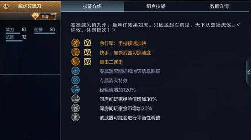 作为一款英雄级近战武器,威虎碎魂刀同样具有手持移速加快的急行军以及加快武器切换速度的快手。除此之外,重击二连击则是威虎碎魂刀的核心技能。与斩神刀、唐刀、丛林匕首这一类武器比较类似,威虎碎魂刀的重击同样能够进行两次连续的攻击。二连击能够大幅度提升使用玩家的容错率,同时也为刀战提升了一定程度的博弈性:敌人需要判断我方到底是使用第一段直接进行攻击,还是采取第一段为佯攻第二段实攻的方式,能够为敌方带来一定的心理压力。
