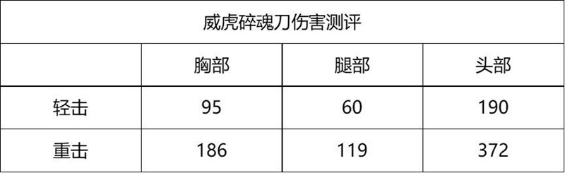 使用威虎碎魂刀时,轻击时除非直接命中头部,否则需要两次攻击才能击败对方。而重击时,无论是第一段还是第二段,攻击到敌方的任意部位,都可以直接击溃对方。具体的伤害数值如下表所示。